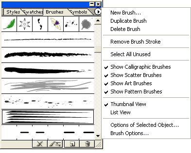 По умолчанию палитра Brashes (Кисти) отображает пиктограммы кистей, но существует возможность выводить только список имен кистей.