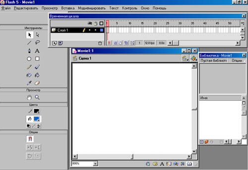 Знакомство с Flash лучше всего начать с входящих в комплект поставки интерактивных уроков. Таким образом, практикуясь па конкретных примерах, вы приобретете навыки работы с основными инструментами Macromedia Flash 5 (рис. 1.1), перечисленными ниже.