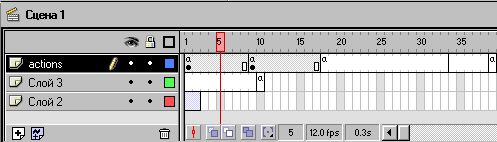 Если вы хотите, чтобы какие-то события возникали в определенном месте фильма (т. е. при достижении воспроизводящей головкой определенного кадра), назначьте процедуру этому кадру. Например, чтобы создать в фильме цикл между 10-м и 20-м кадрами, назначьте 20-му кадру фильма процедуру "перейти к 10-му кадру и продолжить воспроизведение". Удобно поместить все процедуры кадра в один слой, чтобы упростить их поиск и работу с ними. Кадры с процедурами помечаются во временной диаграмме строчной буквой "а" (рис. 12.4).