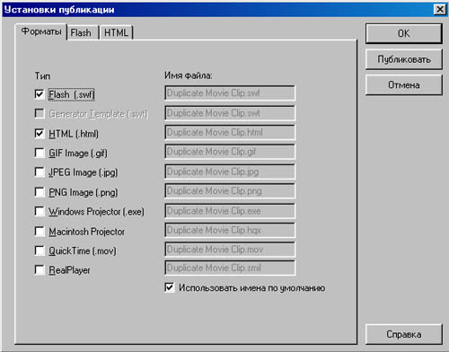 Команда Publish (Публиковать) готовит содержание Flash для публикации в Интернете. Поддерживаются различные форматы экспорта и настройки для каждого из них в окне Publish Settings (Настройки публикации), изображенном на рис. 15.3. Дизайнеры могут создавать собственные файлы шаблона с уникальными инструкциями и синтаксисом HTML.