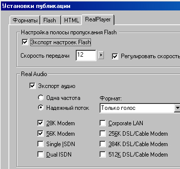 Авторы могут устанавливать параметры звука, кроме того, поддерживается технология SureStream, обеспечивающая качественное воспроизведение для различных типов сетей.