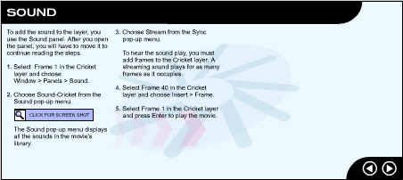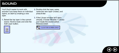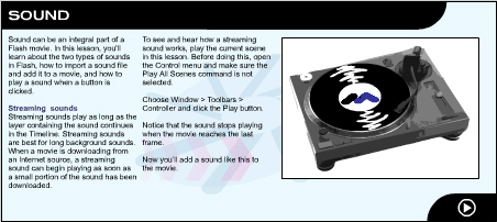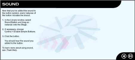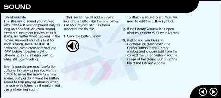 Звуки-события лучше всего подходят для "озвучивания" кнопок. Причина здесь следующая. В большинстве случаев кнопки добавляются к фильму, чтобы дать пользователю возможность воспроизвести фильм с новой сцены. Если звук, воспроизводимый после щелчка на кнопке, при переключении на новую сцену внезапно прерывается, как было бы при использовании потокового звука, это может смутить пользователя.