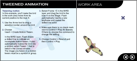 В слое BIRD (Птица) на временной диаграмме появляется пунктирная линия, означающая незавершенное кадрирование. Изображение автоматически преобразуется в символ, которому присваивается имя Tween1, и новый символ вносится в библиотеку. Изображение, к которому применяется кадрирование, обязательно должно быть сгруппировано или являться символом.