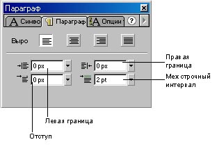 Для текста можно задать атрибуты шрифта и параграфа. Шрифт - набор алфавитных и цифровых знаков, имеющих особый дизайн. Атрибуты шрифта описывают семейство шрифта, размер, стиль, цвет, автокернинг и сдвиг-Атрибуты параграфа описывают выравнивание, границы, сдвиги и межстрочный интервал.